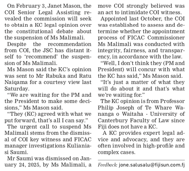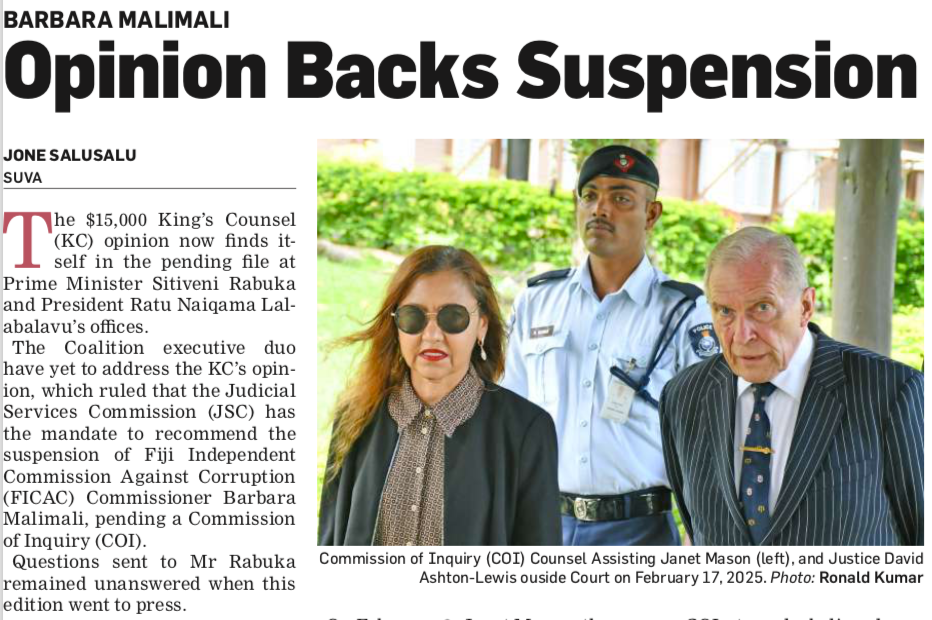 The “Commission of Inquiry” (CoI) was set up by the government of Fiji, which has supreme authority in all aspect of legal jurisprudence over the “Malimali” affair and yet when the CoI suggested Malimali’s suspension the government failed to act upon their recommendation. Now it is revealed that there is a similar recommendation to suspend Malimali from an eminent King’s Counsel, from NZ. Legally, the Court of Inquiry is a quasi-judicial body exercising judicial functions and has supreme authority on adjudicating matters before it as set up under the Constitution of Fiji. In my opinion, therefore, any legal advice given by an outside body may carry less weight compared to the legal powers vested in the CoI.