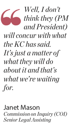 Address the issue Ms. Mason raised about government and state house possible reluctance to act on the CoI findings and make them public without fear or favour.