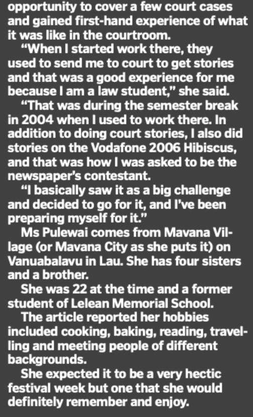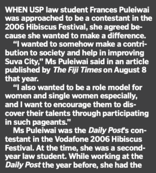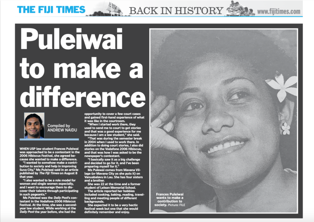 Now here’s something totally bizarre – the Fiji Times “Back in History” page today shining a spotlight on Francis Puleiwai – the heroine of our times at FICAC – when she was starting out in the law back in 2006 – 19 years ago – and was a contestant in the Miss Hibiscus competition.