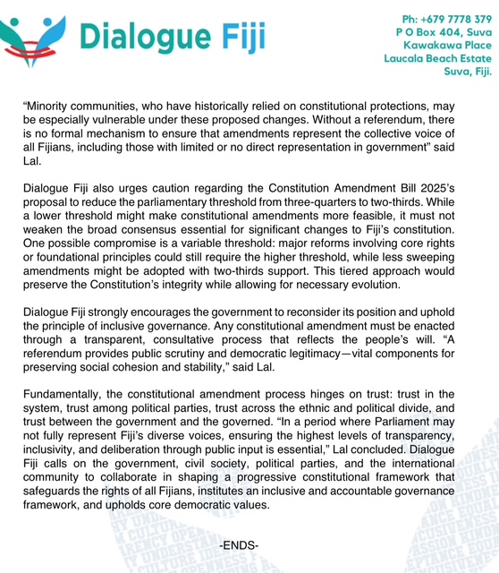 Dialogue Fiji and its head, Nilesh Lal, have thrown a big spanner into the Coalition government’s blueprint to change the 2013 Constitution with a statement criticising its plan to remove the requirement for a referendum of voters and rely solely on a vote in Parliament to push through its agenda.