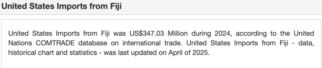 So it’s worth Fiji authorities pursing this obvious error on the part of the USA administration in determining the 63% tax Fiji imposes on US products and the commensurate reprisal from Trump. But I suspect there are other matters afflicting much larger economies that are on the list of pressing issues at the White House.