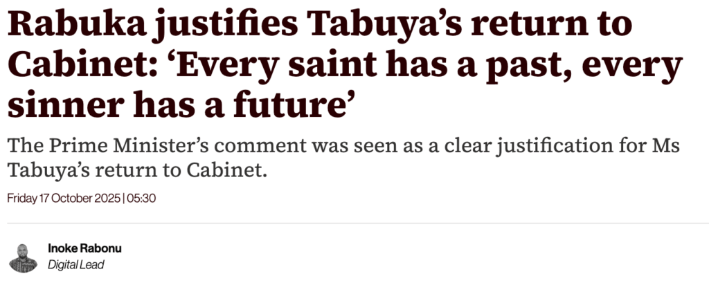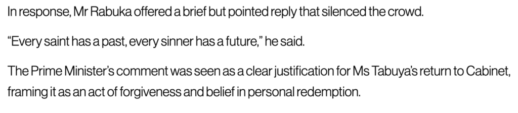Yes, Lynda Tabuya’s conduct has been the conduct of a sinner alright. Even leaving aside any moral judgment, this whole squalid episode has been a “sin” against all accepted standards of political conduct. And of community expectations that those we choose and pay handsomely to represent us should set an example as role models, especially to our young people .
