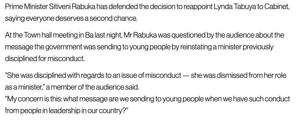 Alone in the democratic world, only in Fiji would a Prime Minister make a virtue of promoting a disgraced cabinet minister who he and his party found guilty of a “sex and illicit drug scandal” and sacked as Minister for Women and Children only to bring her back to be the government’s principal spokesperson with the media and the Fijian people.