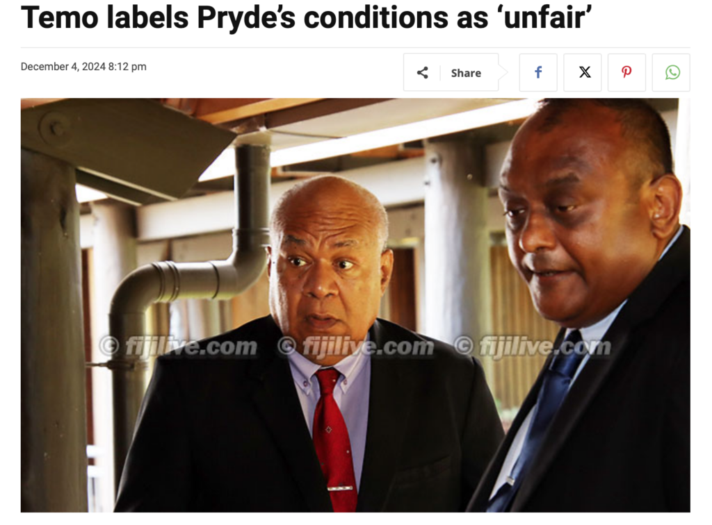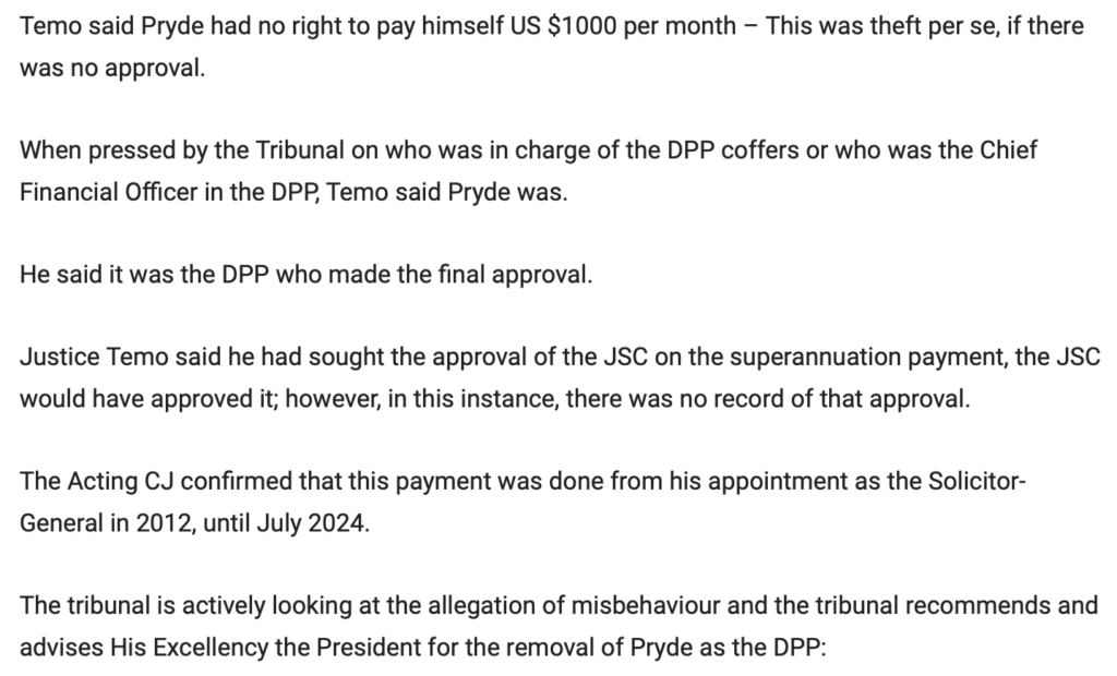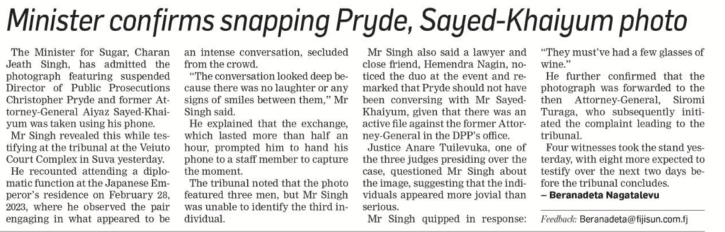Fancy the head of the judiciary having the gall to accuse the DPP of being “unfair” for insisting on proper representation just days after the Fiji Law Society told the Tribunal that pressing ahead with the hearing without Christopher Pryde violated his constitutional right to fairness. Salesi Temo is a serial violator of the Constitution – an outlaw and an oaf bereft of the most basic judgment and common sense. And he poses a clear and present danger to confidence in the criminal justice system and the rule of law in Fiji.