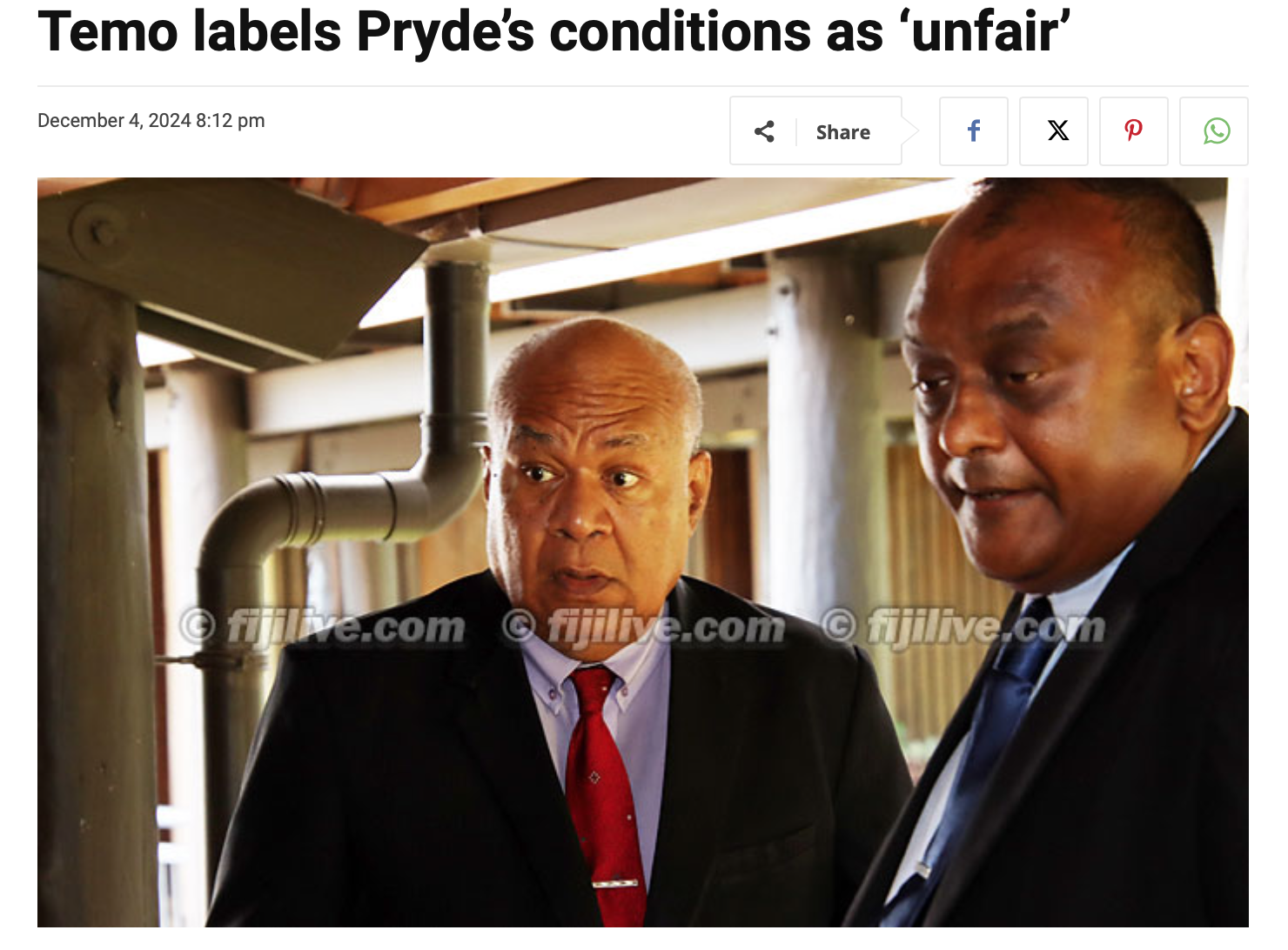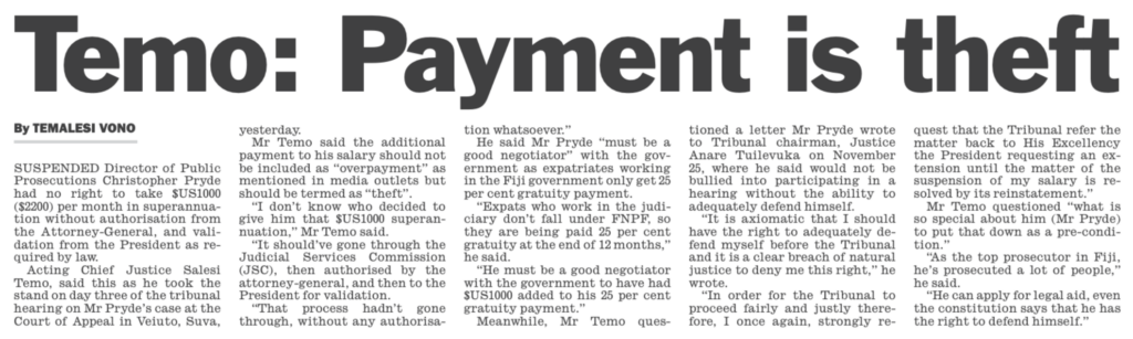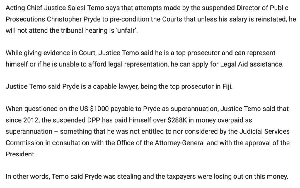 The Acting Chief Justice has made an outrageous smear against the DPP in accusing him of stealing from the Fijian people. And it is compounded by Salesi Temo doing so when he knows that Christopher Pryde can’t respond to the accusation because he withdrew from the proceedings after the Acting Chief Justice stole his salary – unlawfully cutting him off from the ability to pay his defence counsel and adequately defend himself.