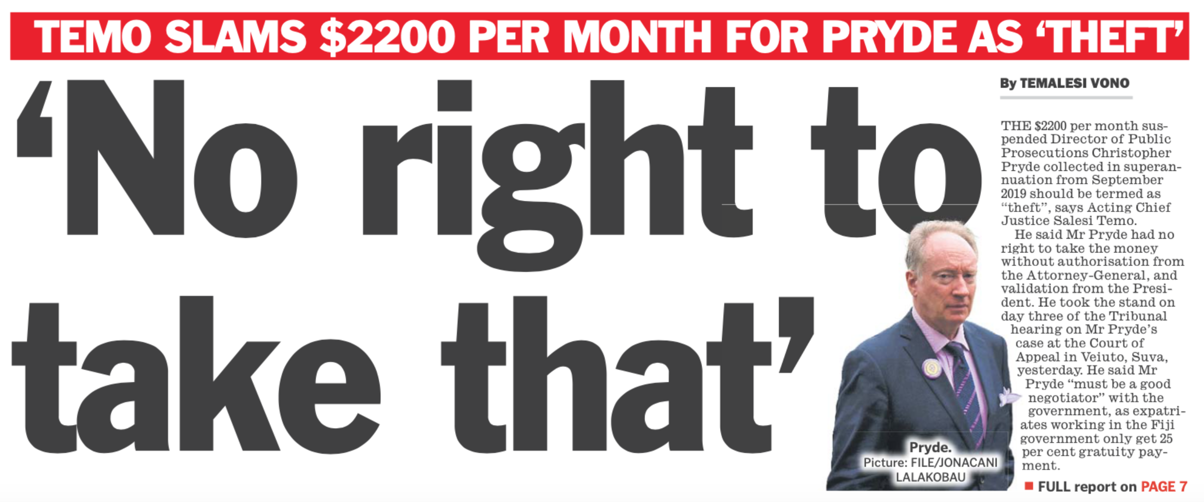 It beggars belief that the most senior judge in the country accused the DPP in open court on Wednesday of “stealing” superannuation that he claims Christopher Pryde is not entitled to when that superannuation extends back to the time when Pryde was solicitor general and has been the subject of repeated audits in the eleven years that he has held public office in Fiji.
