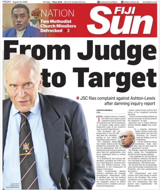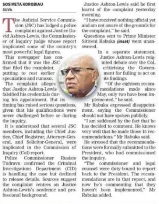 The Chief Justice as head of the Judicial Services Commission has accused the Judge of falsifying his professional credentials despite Justice Ashton-Lewis having been judge in Fiji since the early 1990s – first on the High Court and now the Supreme Court – and there never having been any question of his qualifications to do so.