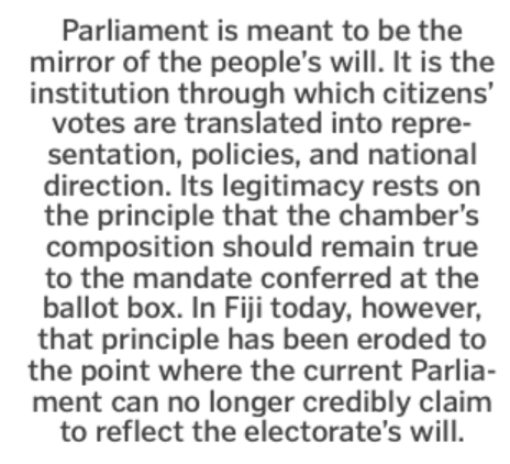 In any event, Fiji needs a fresh election because the current parliament no longer reflects the will of the people. Don’t take my word for it. It’s the view of the influential head of Dialogue Fiji, Nilesh Lal, in an opinion piece in today’s Fiji Times that we are republishing below.