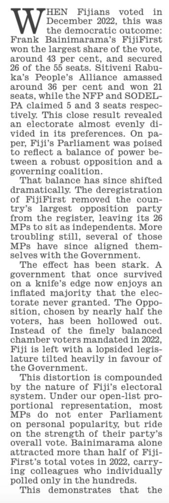 The 2013 constitution that Dialogue Fiji would have us preserve provides zero ‘representative’ functional process for a voter to hold an MP, political party or Government to account.
