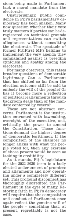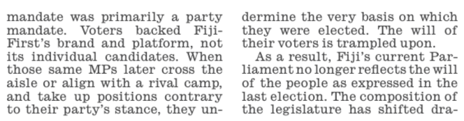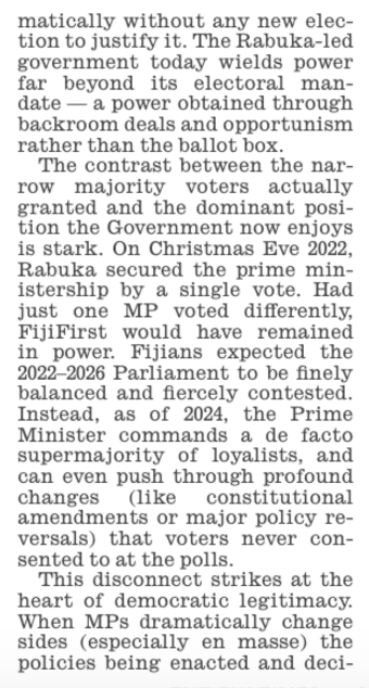 The 2013 constitution has produced a feeble, wretched facsimile of a parliamentary democracy. I have always argued that that was exactly as Bainimarama and Sayed-Khaiyum wished: The appearance of democracy without the boring bits of being directly accountable to taxpayer voters.