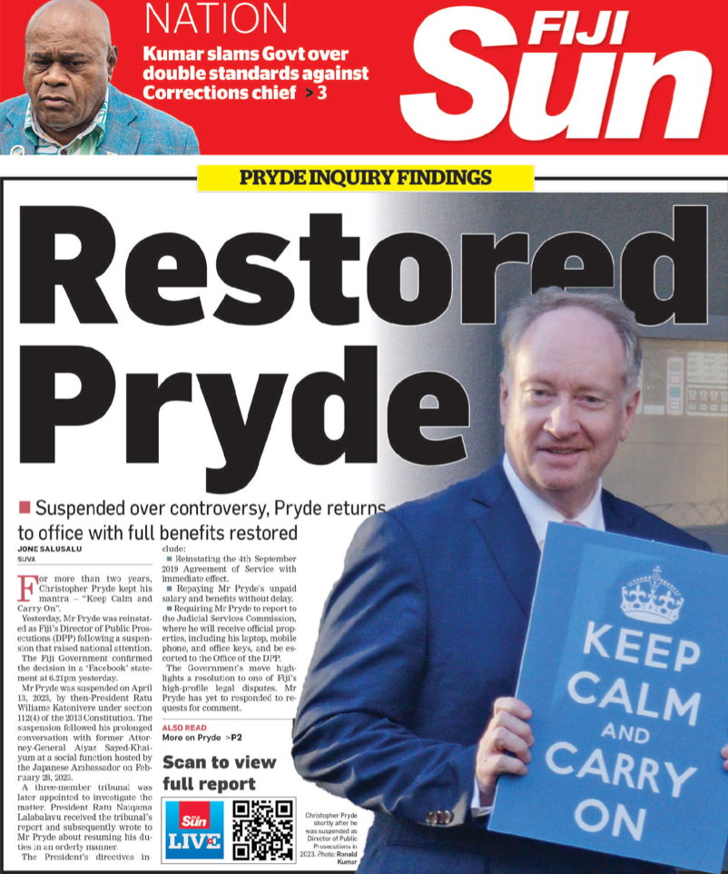 Time will tell whether these reports are true and very soon. Because Pryde’s first day back at work on Monday is scheduled to start with a meeting with Salesi Temo in the CJ’s office. It promises to be an extraordinary encounter – the exonerated DPP coming face-to-face with the man who advised the former president to suspend him in April 2023, kept him waiting 21 months for justice, cut off his salary and falsely branded him a thief.