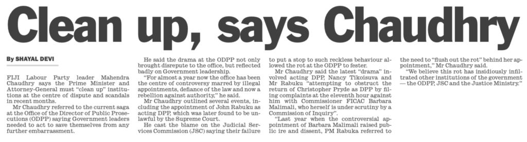 The nation will be closely watching what happens in the coming days. But as time goes on, it has become clear to all but the most gormless that there is something very rotten in the state of Fiji – an attack on the rule of law that is already triggering widespread concern but will escalate to alarm if some of the current rumours are confirmed. That concern is reflected in the latest statement by the Labour Party leader and former prime minister, Mahendra Chaudhry. (see below)