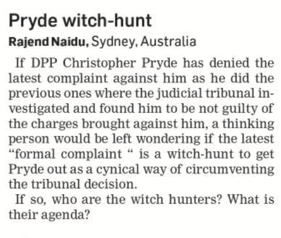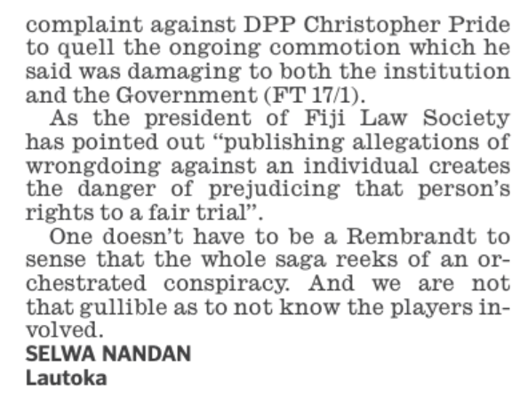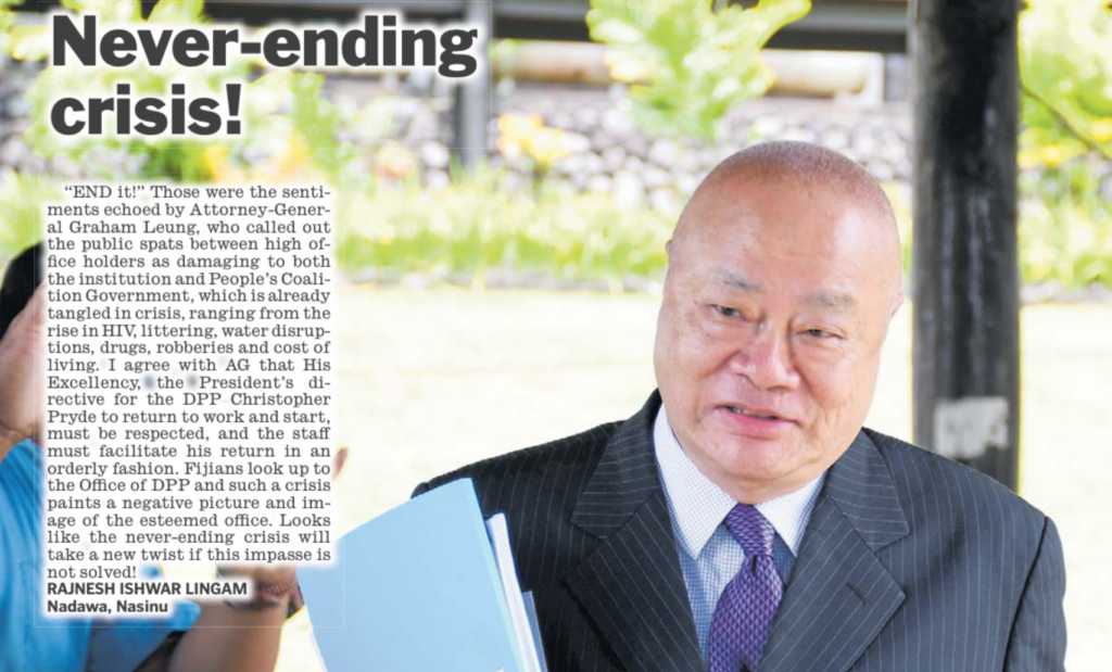 The answer to that is probably “yes”. Because these people want Christopher Pryde gone. They don’t accept the 2013 Constitution on which he was tried and acquitted. They want a DPP who isn’t independent and will carry out their agenda. And the great tragedy for Fiji is that they will stop at nothing to achieve their aim.