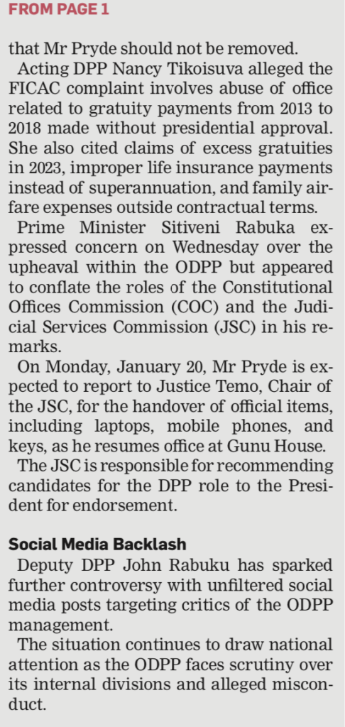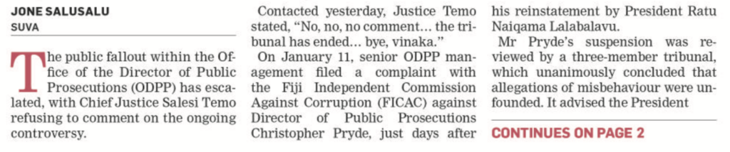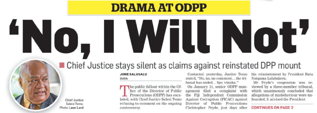 As the furore rages over the senior staff rebellion at the ODPP over the reinstatement of Christopher Pryde, attention is starting to focus on the behind-the-scenes role of the Chief Justice, Salesi Temo, and whether he is colluding with the acting DPP, Nancy Tikoisuva, and the FICAC Commissioner, Barbara Malimali, to thwart Pryde’s return.