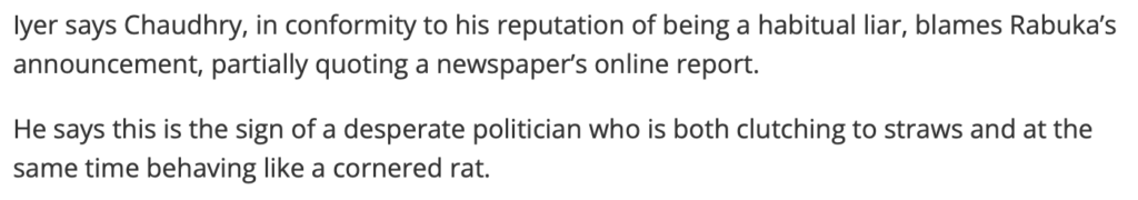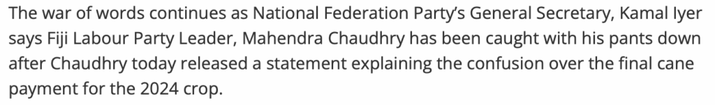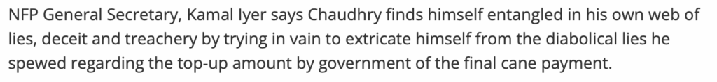 Is the NFP terrified that Mahendra Chaudhry‘s Labour Party is going to pose an existential threat to it when voters go to the polls next year? It’s a fair bet given the extreme language employed by Biman Prasad‘s General Secretary, Kamal Iyer, against the Labour leader and former prime minister.