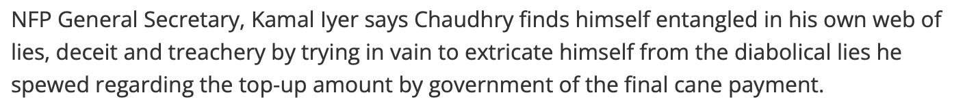 Is the NFP terrified that Mahendra Chaudhry‘s Labour Party is going to pose an existential threat to it when voters go to the polls next year? It’s a fair bet given the extreme language employed by Biman Prasad‘s General Secretary, Kamal Iyer, against the Labour leader and former prime minister.