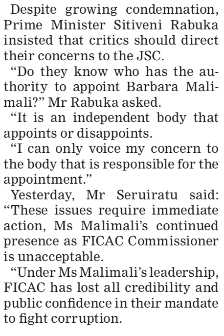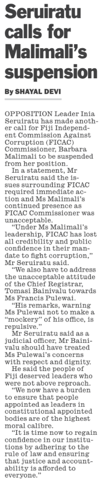 Here’s the Prime Minister’s risible response to Inia Seruiratu’s latest call for Barbara Malimali to be stood down. It is a disgrace.