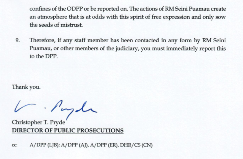 There’s another sinister element to the evidence given by Susanna Vuniyani. Because Christopher Pryde suspects that she was part of a clandestine attempt by the Resident Magistrate, Seini Puamau, to recruit informants in the ODPP to spy on him as part of a concerted conspiracy to replace him with an iTaukei appointment. Christopher Pryde issued a memo to his staff exposing the plan and telling them to have nothing more to do with Seini Puamau (see below). He also lodged a formal complaint against Puamau with Salesi Temo. But to this day, nothing has been done about that complaint. And again, Pryde’s counsel wasn’t present to cross examine Susana Vuniyani about whether she was part of a conspiracy to remove the DPP.