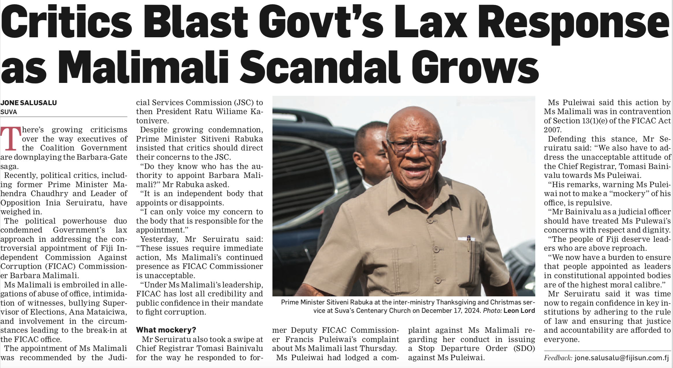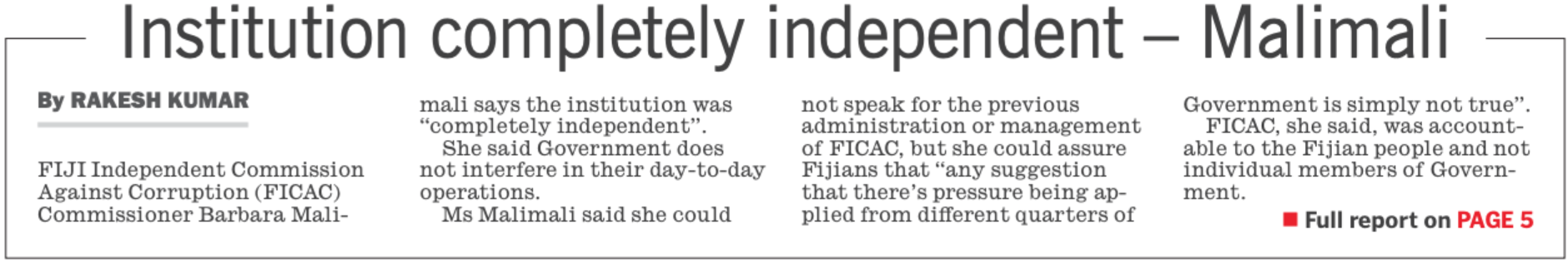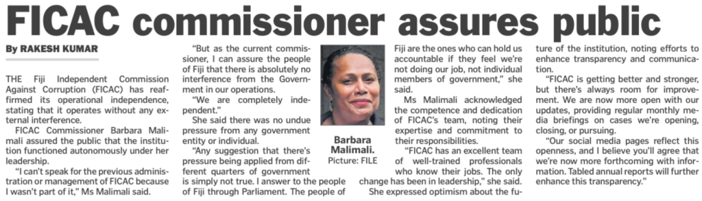 Malimali is on the front page of the Fiji Times today continuing to insult our intelligence with the claim that FICAC is genuinely independent.