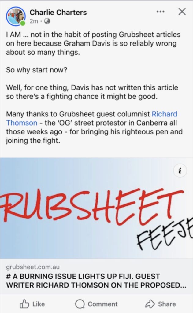 And then there are the other stories Grubsheet “has got wrong” – like the first to break the news that the Prime Minister is appealing the Tuiqereqere judgment on the Malimali sacking; the first to reveal that Frank Bainimarama is behind the new FijiansFirst Party; Plus a whole lot of stories we have broken in these columns over the years that were way ahead of the mainstream media pack.