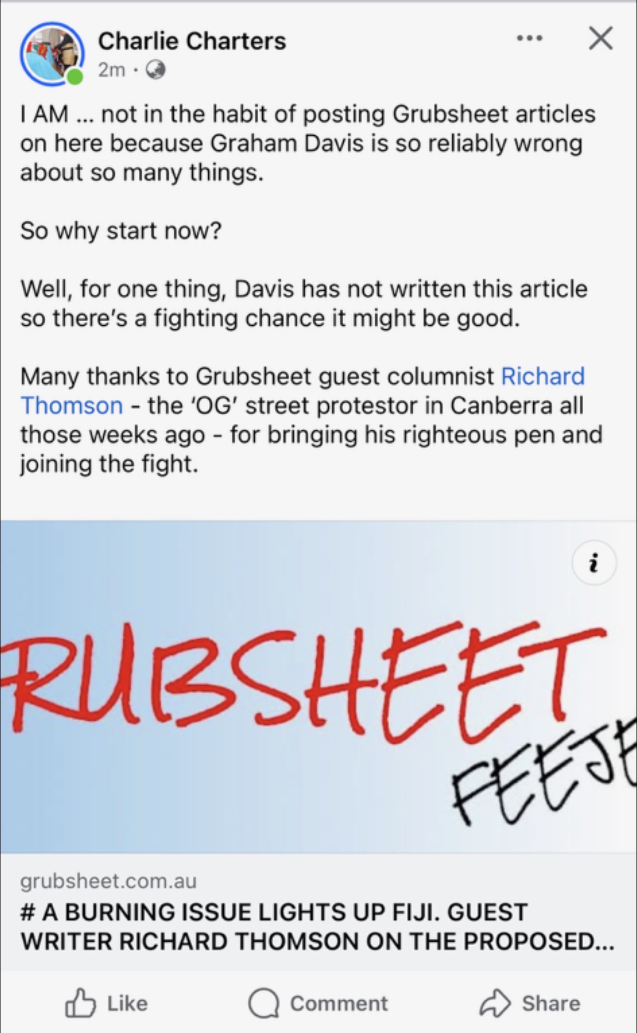 In the meantime, I am trying to persuade Richard Thomson to write more articles for Grubsheet, partly because of his ability and lifetime of experience in Fiji and partly to try to attract more positive mentions from Homer.