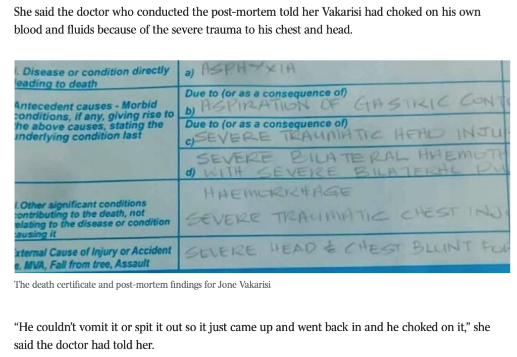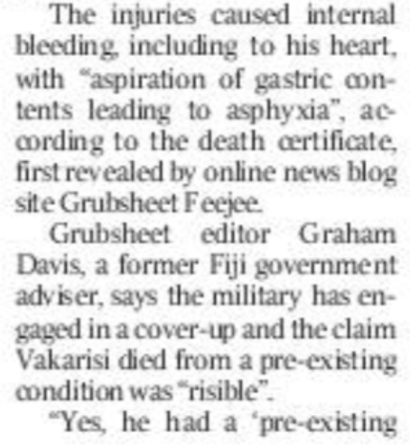 Perhaps Homer is smarting because Grubsheet was the first to reveal the Death Certificate of the murdered Jone Vakarisi, which derailed the RFMF’s attempted cover-up that he had died of a “sudden medical episode” caused by a “pre-existing condition”.