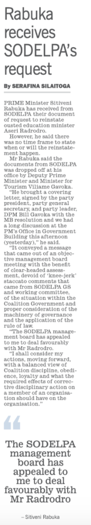In the Fiji Times interview, the Prime Minister also doubles down on his insistence that Radrodro disobeyed him. Which is effectively a repudiation of SODELPA’s position that it was all a “misunderstanding” that the ousted minister didn’t comply with Rabuka’s instructions over Council appointments at the FNU.