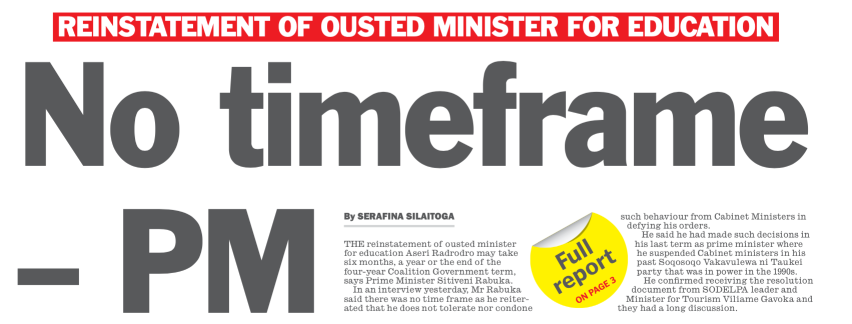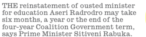 The Prime Minister has given an astonishing interview to the Fiji Times in which he says the reinstatement of Aseri Radrodro as Education minister “may take six months, a year or the end of the four-year Coalition government term”.