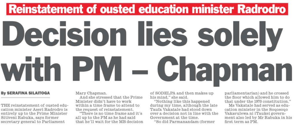 Is the Prime Minister legally entitled to kick the whole issue into touch – to defer making a decision on whether to reinstate Radrodro down the months and even down the years until the government’s term runs out? The answer to that is “yes”, according to the estimable Mary Chapman, the former secretary-general to the parliament. So how’s that for a classic check-mate, Fiji?