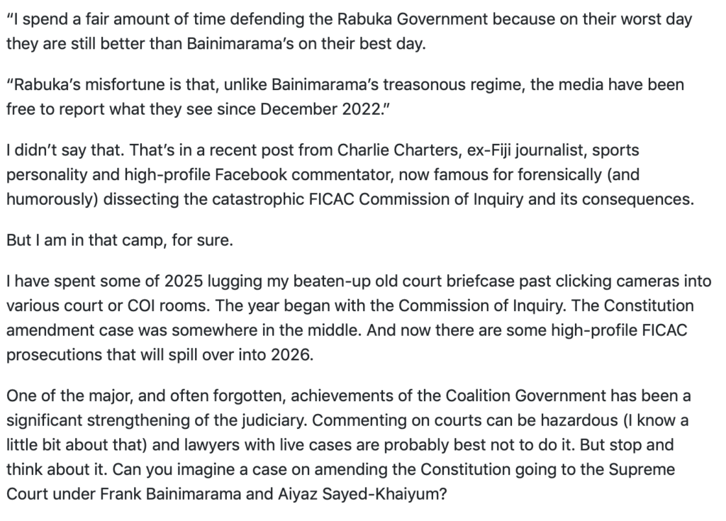 Get that Fiji? “One of the major, and often forgotten, achievements of the Coalition Government has been a significant strengthening of the judiciary”.