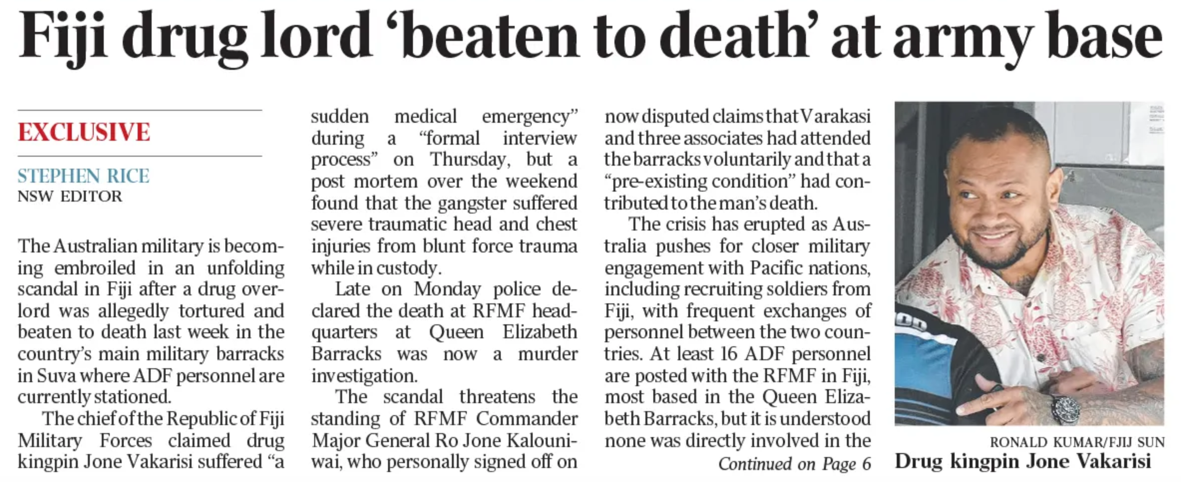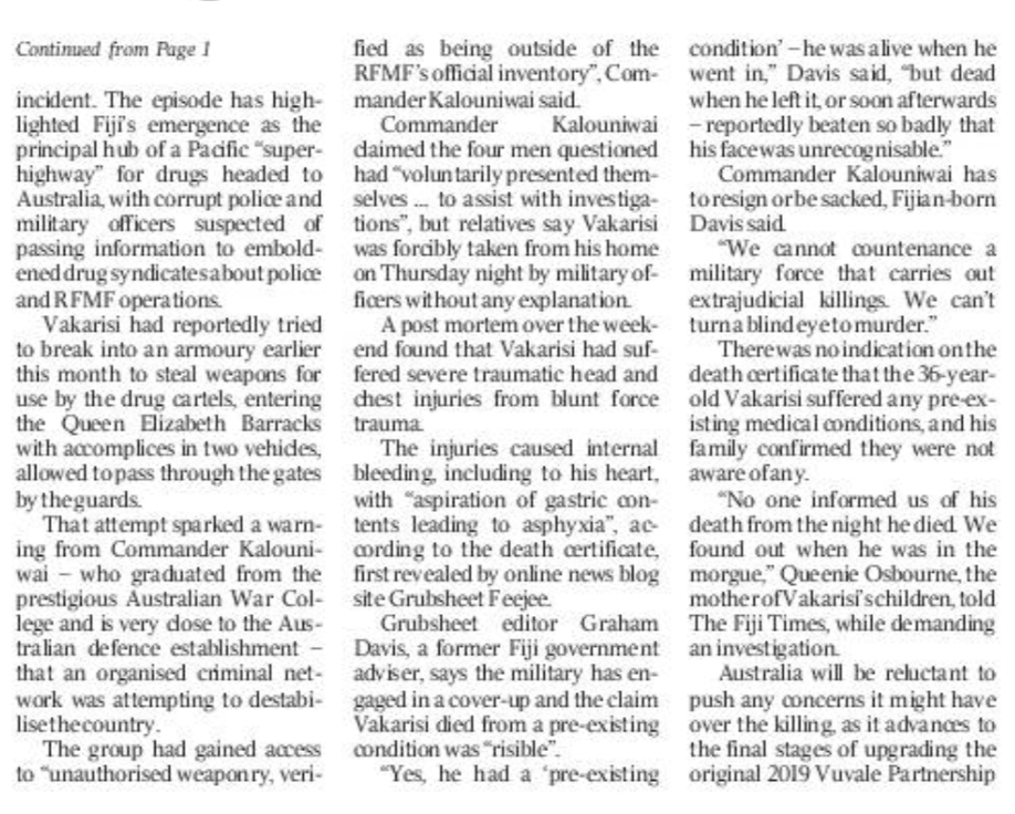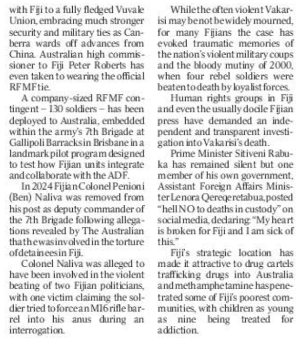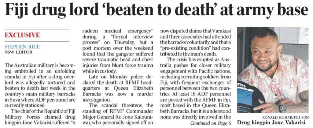 This isn’t going to go away. Far from it. The story is now front page news in Australia with a specific reference to “the Australian military becoming embroiled in an unfolding scandal in Fiji”.