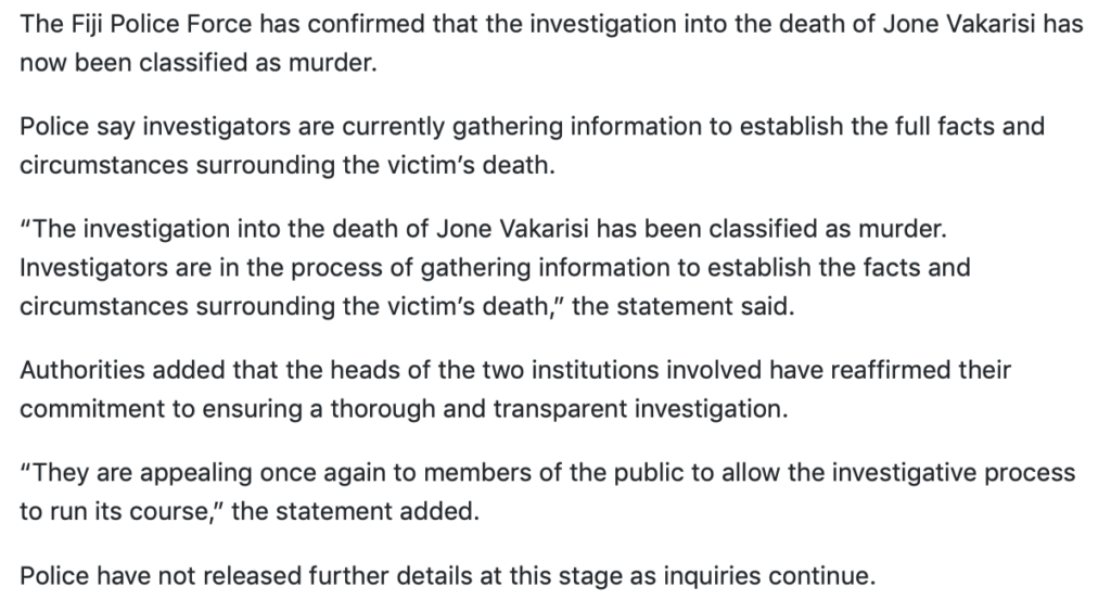 The Commander’s own lack of transparency and accountability comes into sharp focus when you compare this statement to the latest statement from the Fiji Police on the Vakarisi killing.