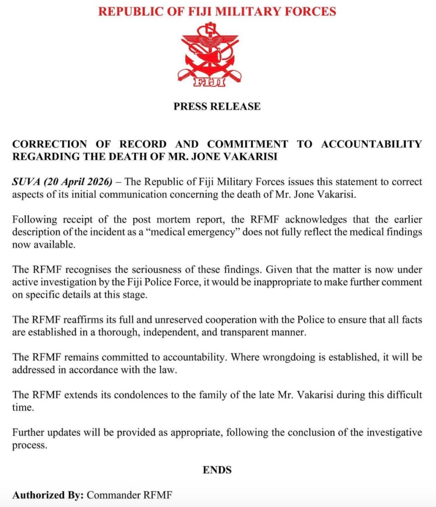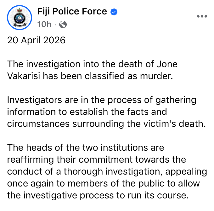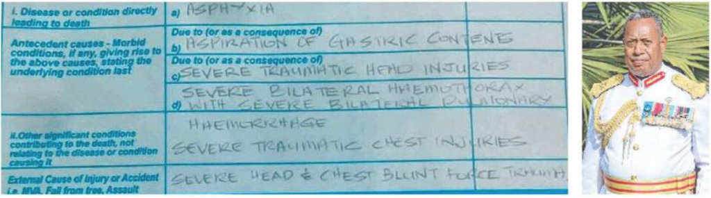The death in RFMF custody of the accused drug overlord, Jone Vakarisi, is now being officially called what it is – murder – after the disgraceful attempt by Major General Ro Jone Kalouniwai to portray it as having been triggered by natural causes – a “sudden medical emergency” caused by a “pre-existing condition”.