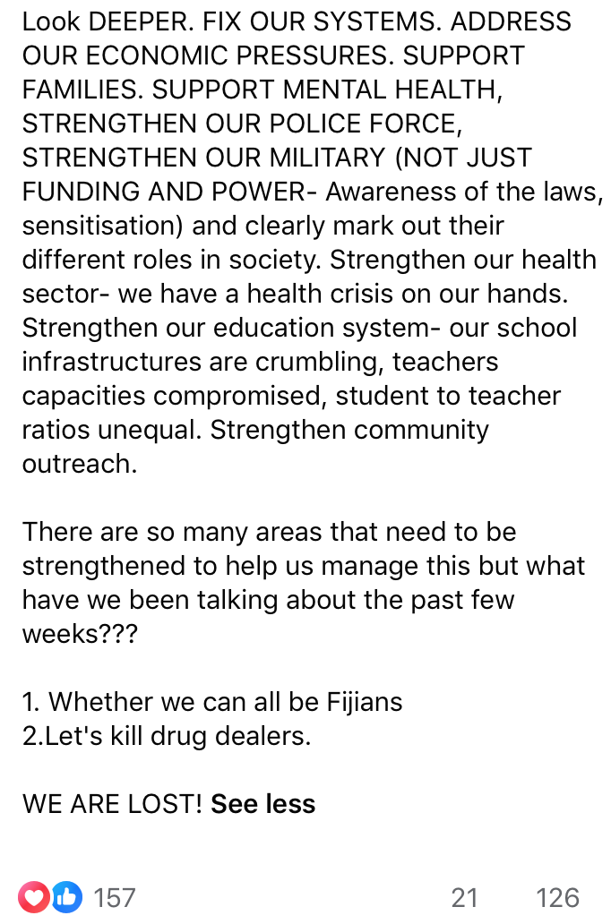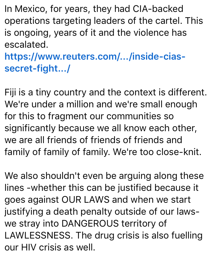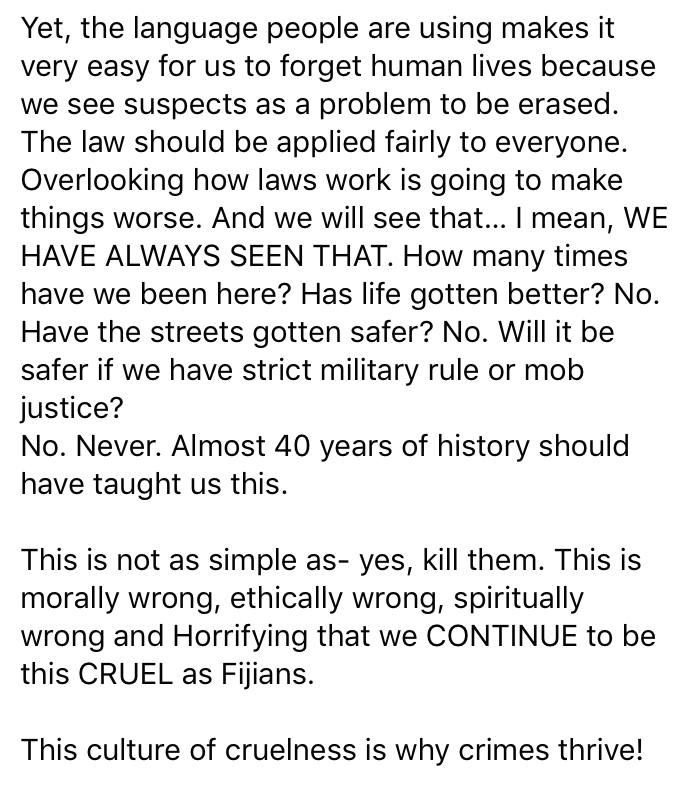 His latest statement is an attempt to make it look like he is professional in his approach but sorry Kalouniwai your integrity is shredded to bits. Your lies have been exposed to the world through your statements. The recent one doesn’t help your attempt to make it right and makes it even worse. Worse is your attempt to justify your murder with people glorifying you and the military. What has our country come to accepting murder and that from the Christian itaukei who are openly commenting in support of his actions.