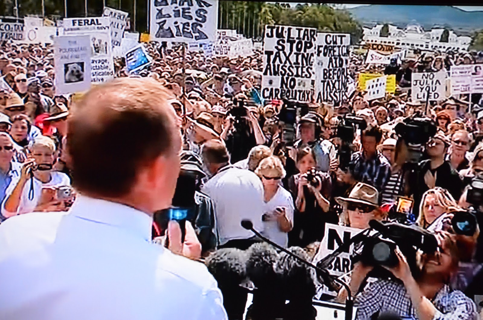 Smith openly boasted on his program of organising the fleet of buses that brought the protestors to Canberra for the carbon protest. He cast it as part of Tony Abbott’s “People’s Revolt” against Julia Gillard’s backflip on her pre-election promise that no carbon tax would be part of any government she led. At face value, this appears to be a worthy crusade against the most heinous cynicism on the part of the prime minister. But only while it isn’t hijacked by the looney right and its fellow travellers, who have the unique ability to box the famous pugilist, Tony Abbott, into the far right corner with one of their celebrated right hooks. And so it transpired in Canberra today.