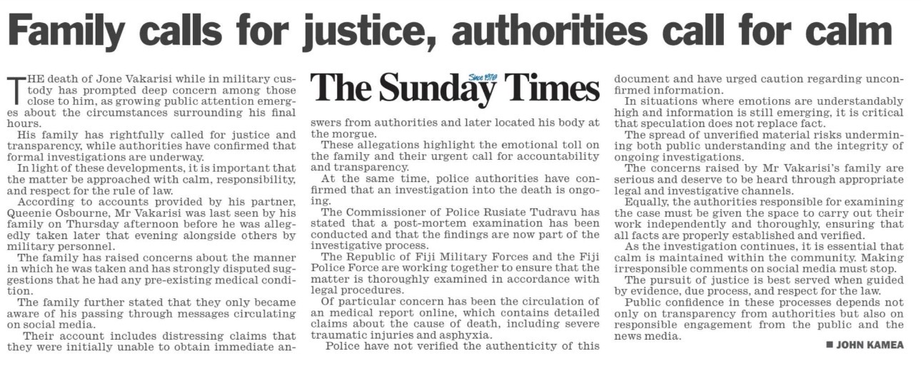 What happened at the Camp with the killing of Jone Vakarisi cannot be accepted by any Fijian who genuinely cares about the nation’s future. And in this instance, the buck stops with the Commander.
