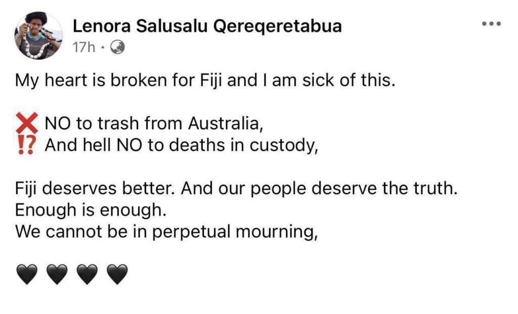 The level of revulsion in the community is such that even one of Sitiveni Rabuka’s ministers, Lenora Qereqeretabua – the Deputy Foreign Minister – has gone public with a cry of anguish about the Vakarisi killing, coupled with the plans for an Australian-sourced waste disposal facility at Saweni in the West.*