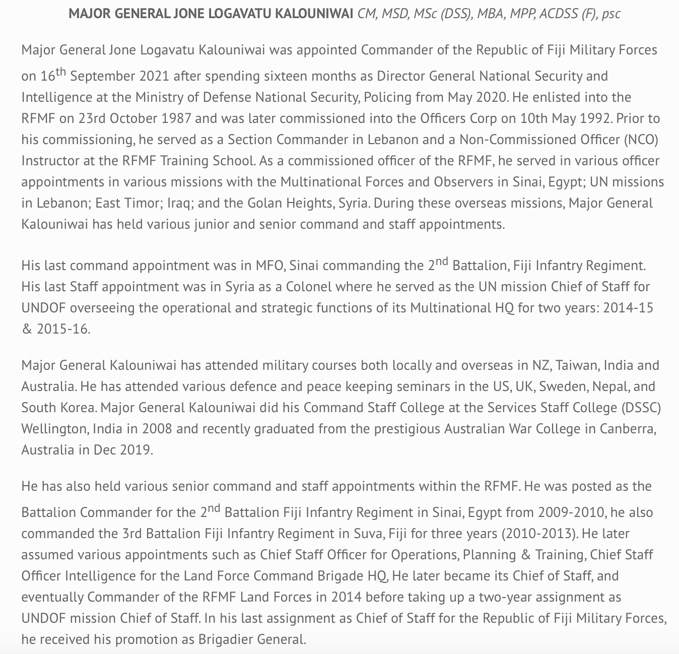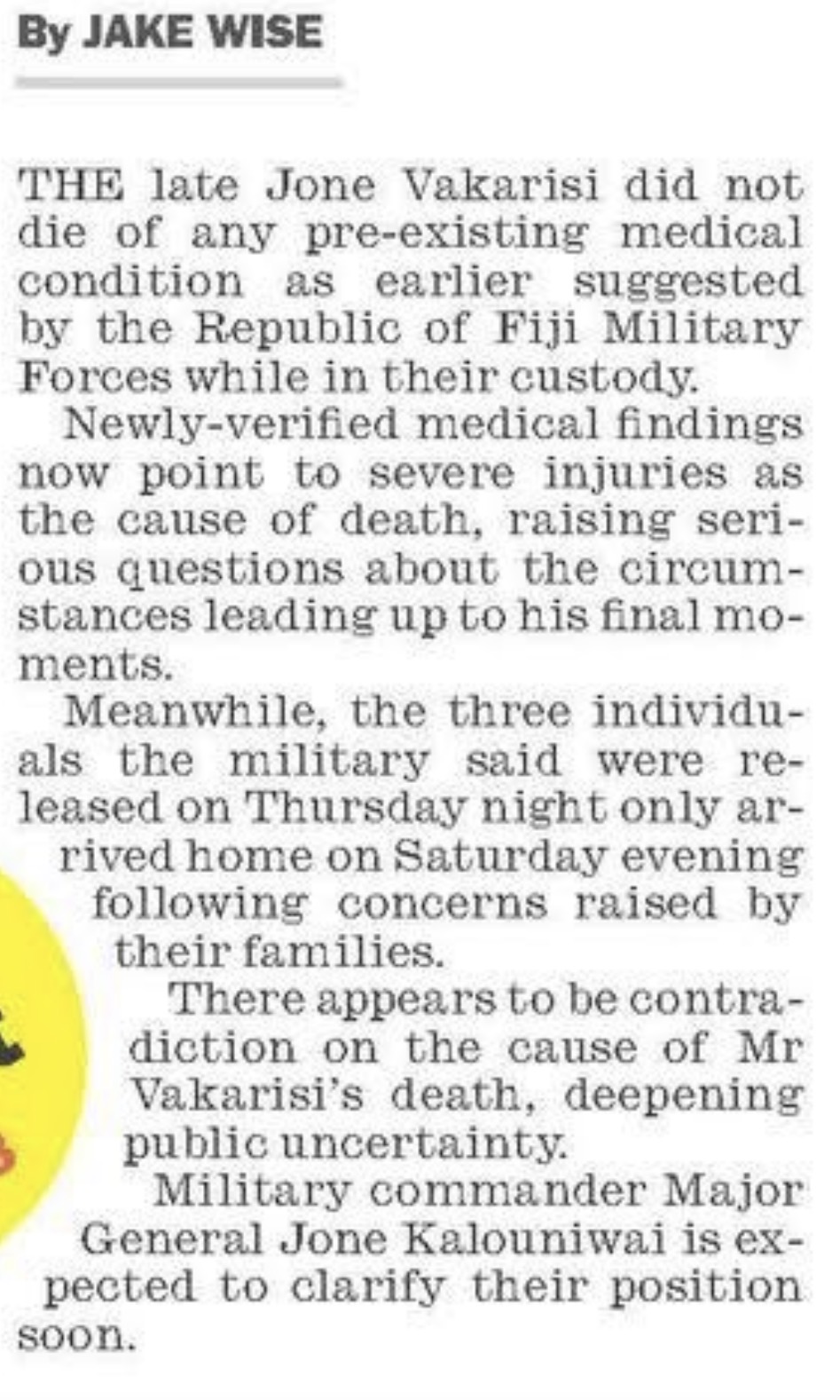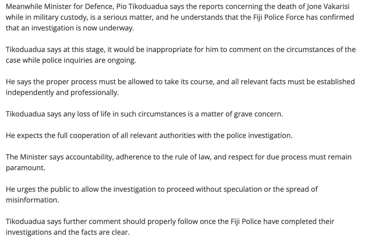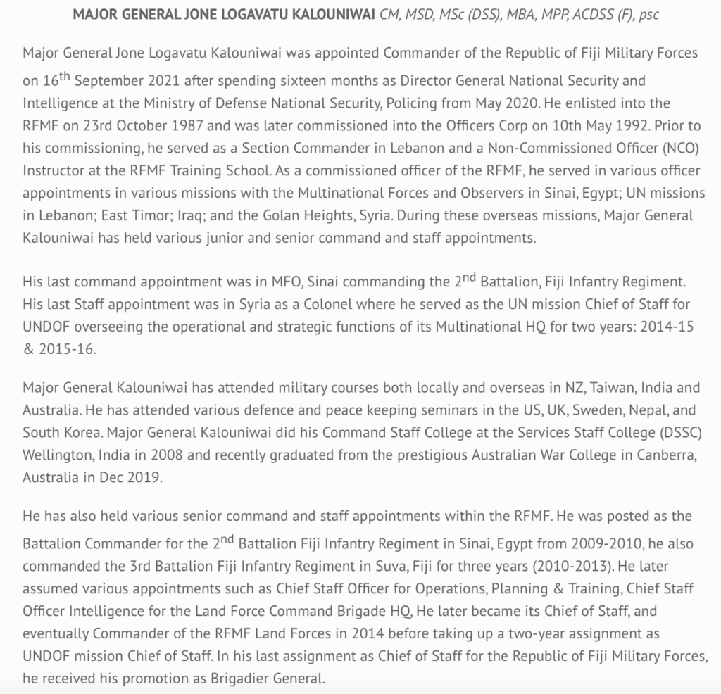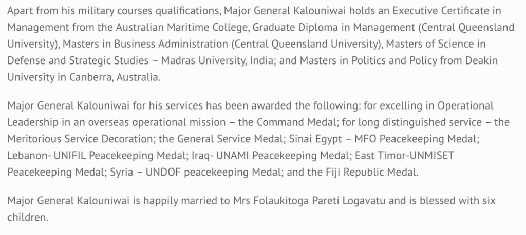 Roberts will be especially mortified by the conduct of the Australian-trained RFMF Commander, Major General Ro Jone Kalouniwai, in lying about the circumstances of Jone Vakarisi’s death. There is no ambiguity about this whatsoever. Kalouniwai issued a statement claiming that Vakarisi had died of natural causes when the truth is that he was tortured and beaten to death.