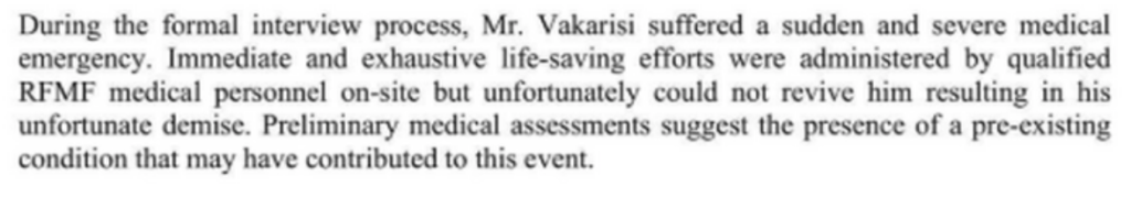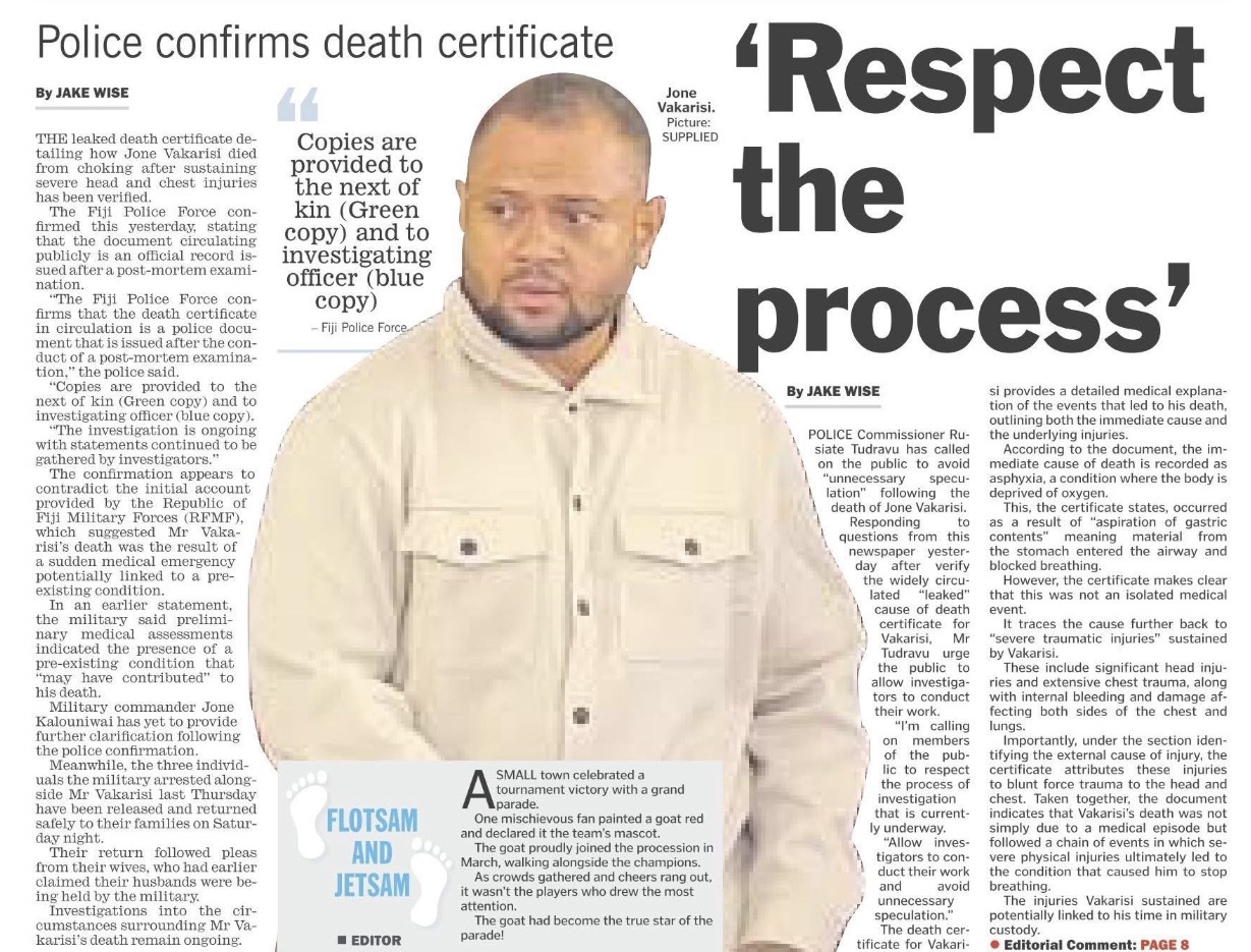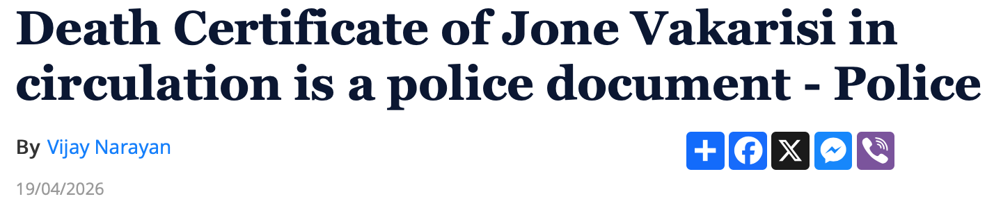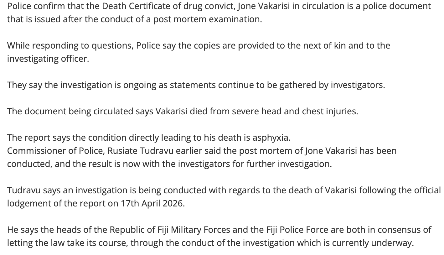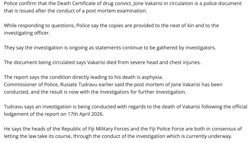 And then the truth of what happened, according to the Death Certificate issued to the Vakarisi family signed by Dr James Kalougivaki – reportedly Fiji’s sole specialist forensic pathologist, whose expertise is unquestioned.