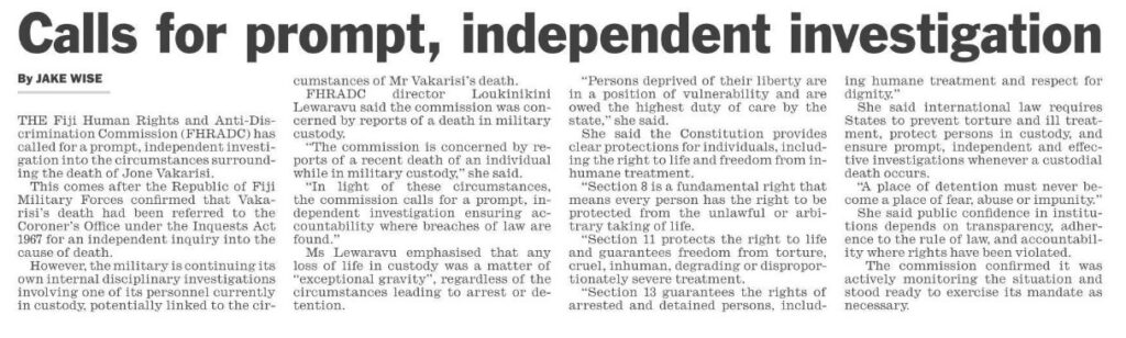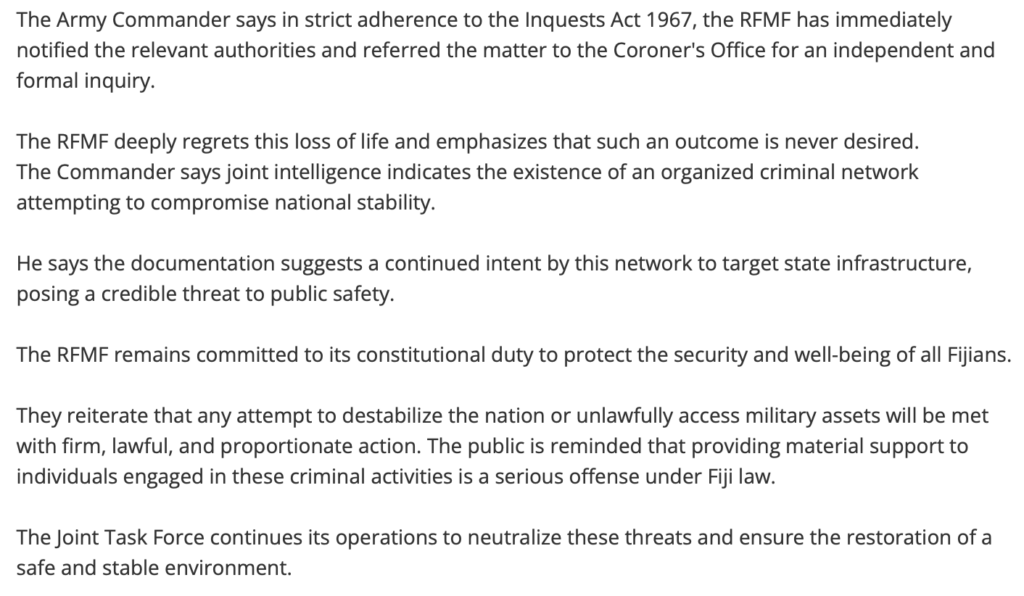 It’s interesting. Every time the RFMF has gotten involved in the policing of the nation, people die. In each instance, the military states the deaths were not at the hands of the military and the individuals died naturally/suddenly while being questioned. Those who really were responsible for the deaths are never held accountable as the military states that the matter is/will be handled internally, as per military protocols; this effectively blocking any further queries from the public or the Police force.