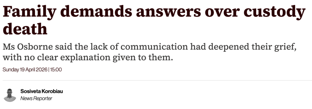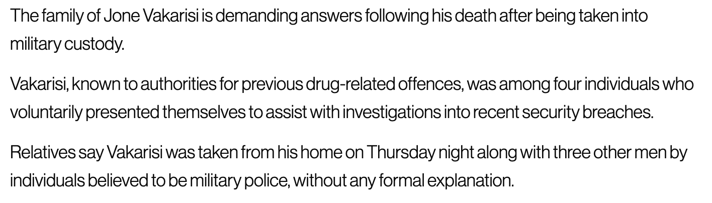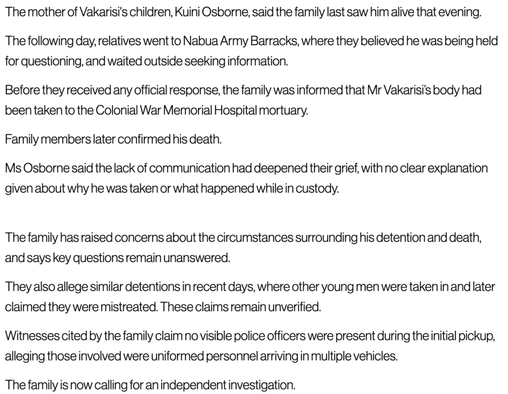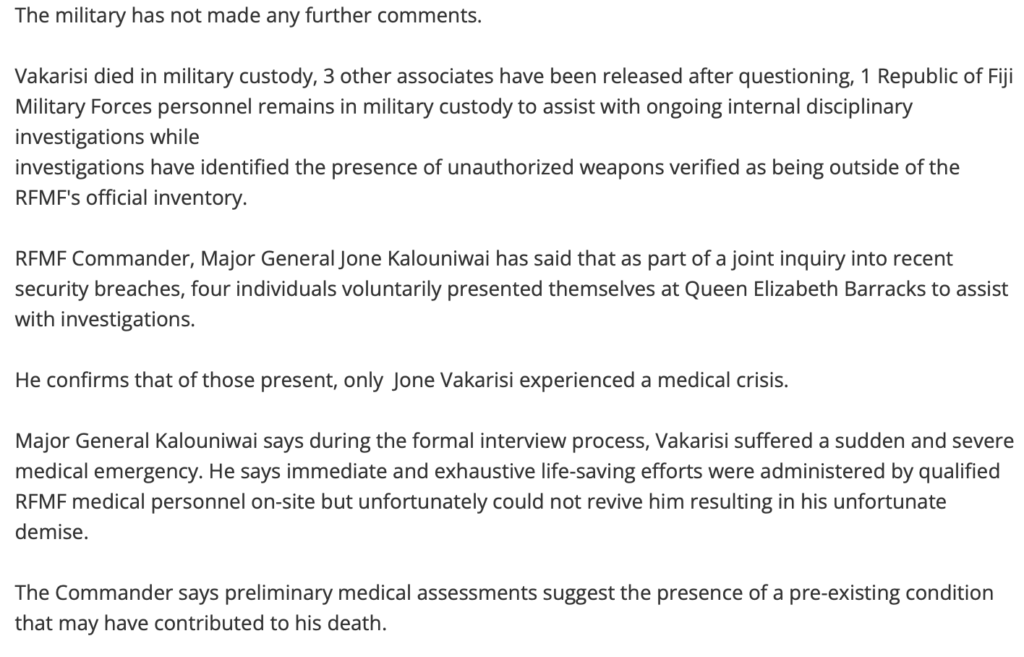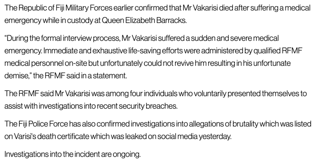At the time of writing, the silence from the Prime Minister, Sitiveni Rabuka, about what has happened is deafening. As is the silence from Kalouniwai himself beyond the risible statement he made that Vakarisi had a “pre-existing condition”. Yes, Commander. The “pre-existing condition” was that your prisoner was alive and well when he entered the Camp. And he was dead when he left it (or soon afterwards), reportedly beaten so badly that his face was unrecognisable.