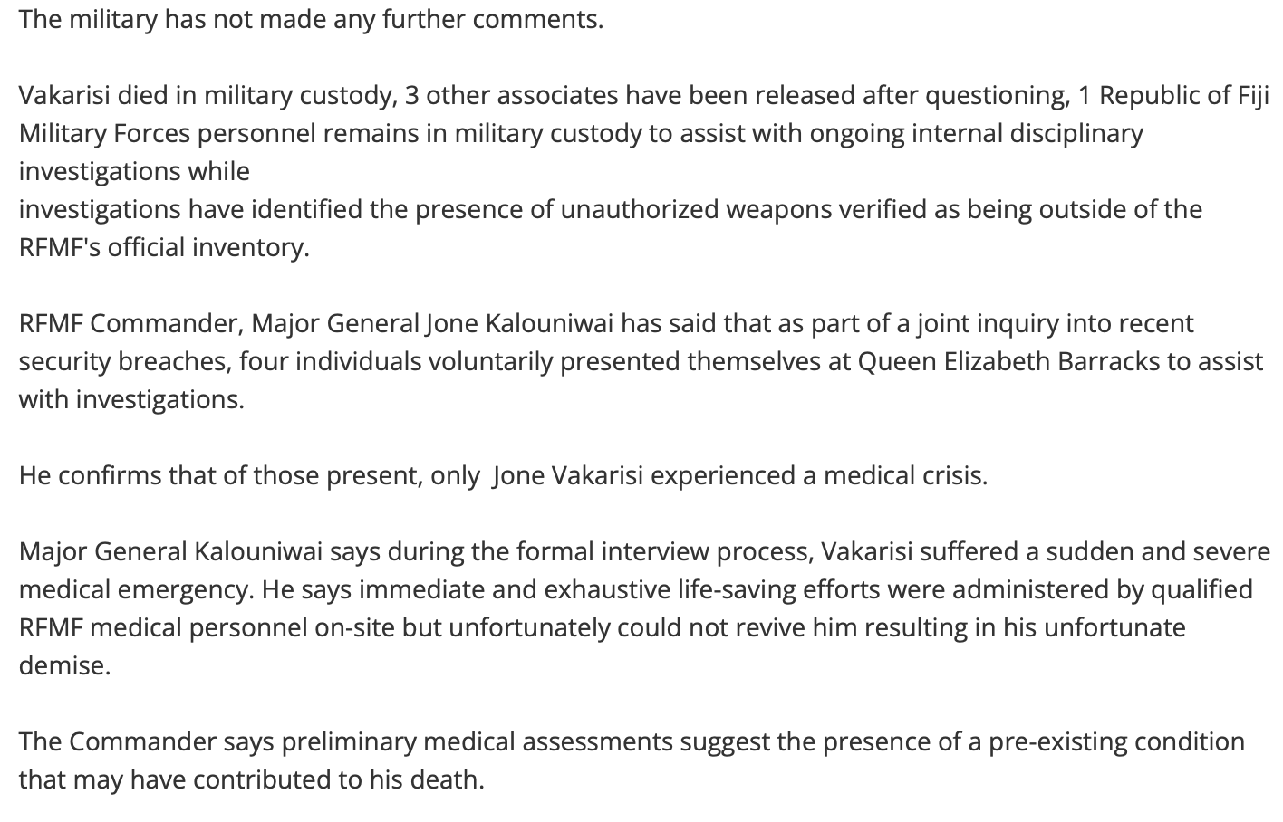 It also appears that the cover-up extended to Vakarisi being taken to Wainibokasi Hospital instead of the much closer CWM because the RFMF personnel responsible thought the incident was less likely to come to light there. And there are even lurid reports of a plan at one stage to dump the body in the Wainbokasi River in the hope that it would never come to light at all – that Vakarisi would have simply disappeared .