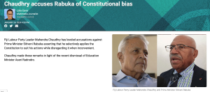 As if the chronic bias of the Fiji Times isn't bad enough, the national broadcaster, FBC, conspires against the readers of its news website by making them search for stories in an avalanche of commercials. Mahendra Chaudhry makes an important point about the Prime Minister's selective approach to the Constitution. Grubsheet said the same thing … [Read more...] about # DIGGING FOR NEWS IN THE CHICKEN COOPS
