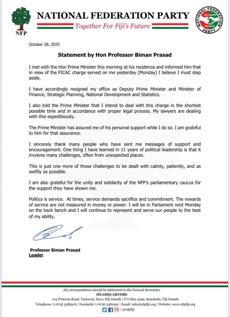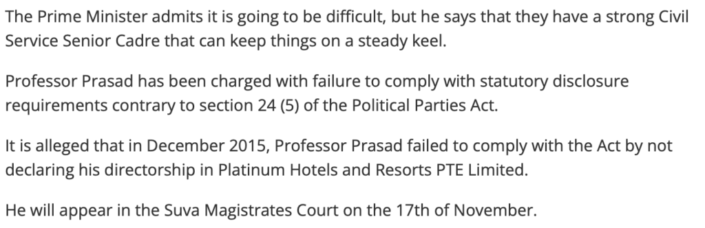 For the record, Biman Prasad’s first court appearance isn’t until November 17. So the case against him that he made a false income declaration to the Elections Office will stretch well into next year and maybe right up to the election, if Sitiveni Rabuka‘s prediction is correct.