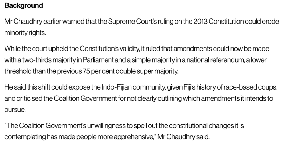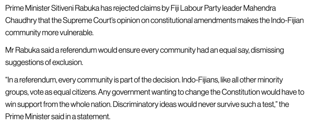 Sitiveni Rabuka doesn’t like the Labour Party leader and former prime minister, Mahendra Chaudhry, pointing out the bleeding obvious – that the Supreme Court decision making it easier for him to change the 2013 Constitution poses a threat to non-indigenous Fijians. But it does.