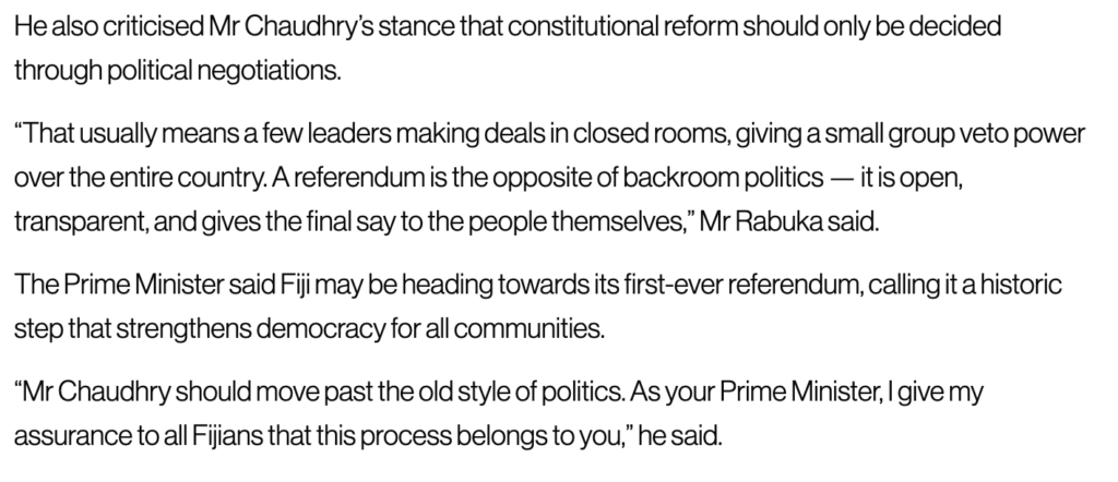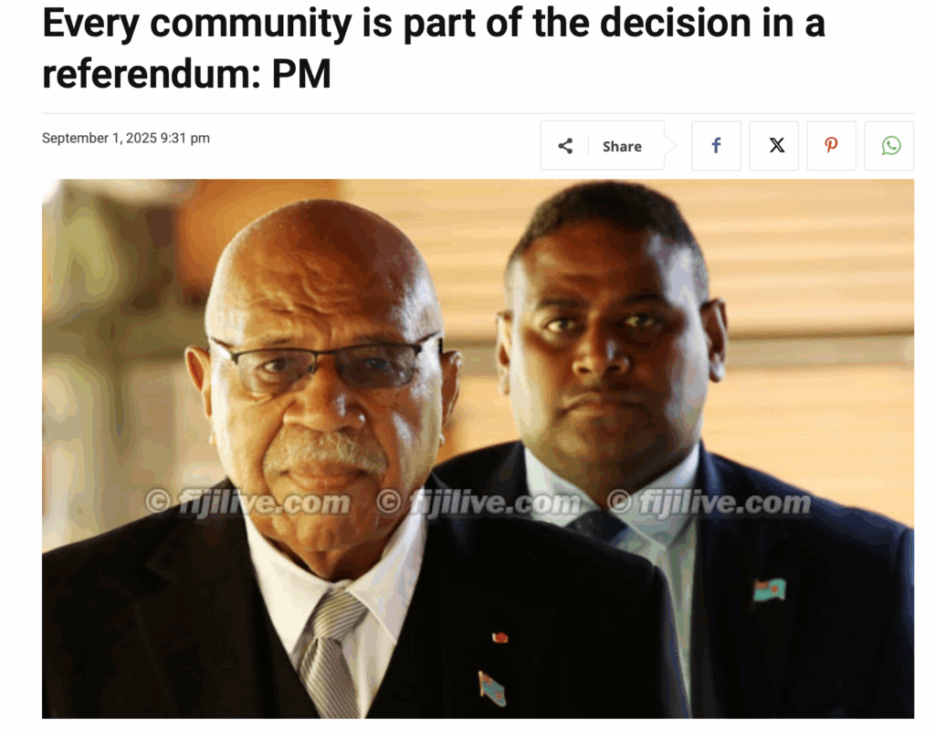 2/ Sitiveni Rabuka and Biman Prasad make public statements that the common and equal citizenry and common identity provisions of the 2013 Constitution are safe. And the Prime Minister gives a cast-iron guarantee that he will protect them and they will not be part of any vote in the parliament and any referendum.