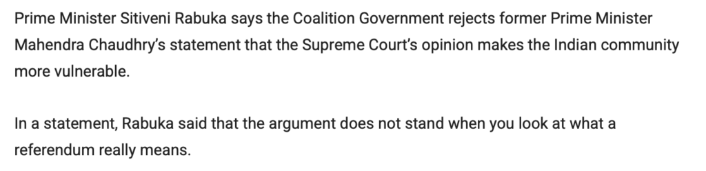 All this – and a lot more – was what Sitiveni Rabuka’s People’s Alliance wanted. It was their formal submission to the Supreme Court hearing. So for the Prime Minister to now say that the minorities have nothing to worry about when he has been given the opportunity to change the existing supreme law is simply an insult to our intelligence.