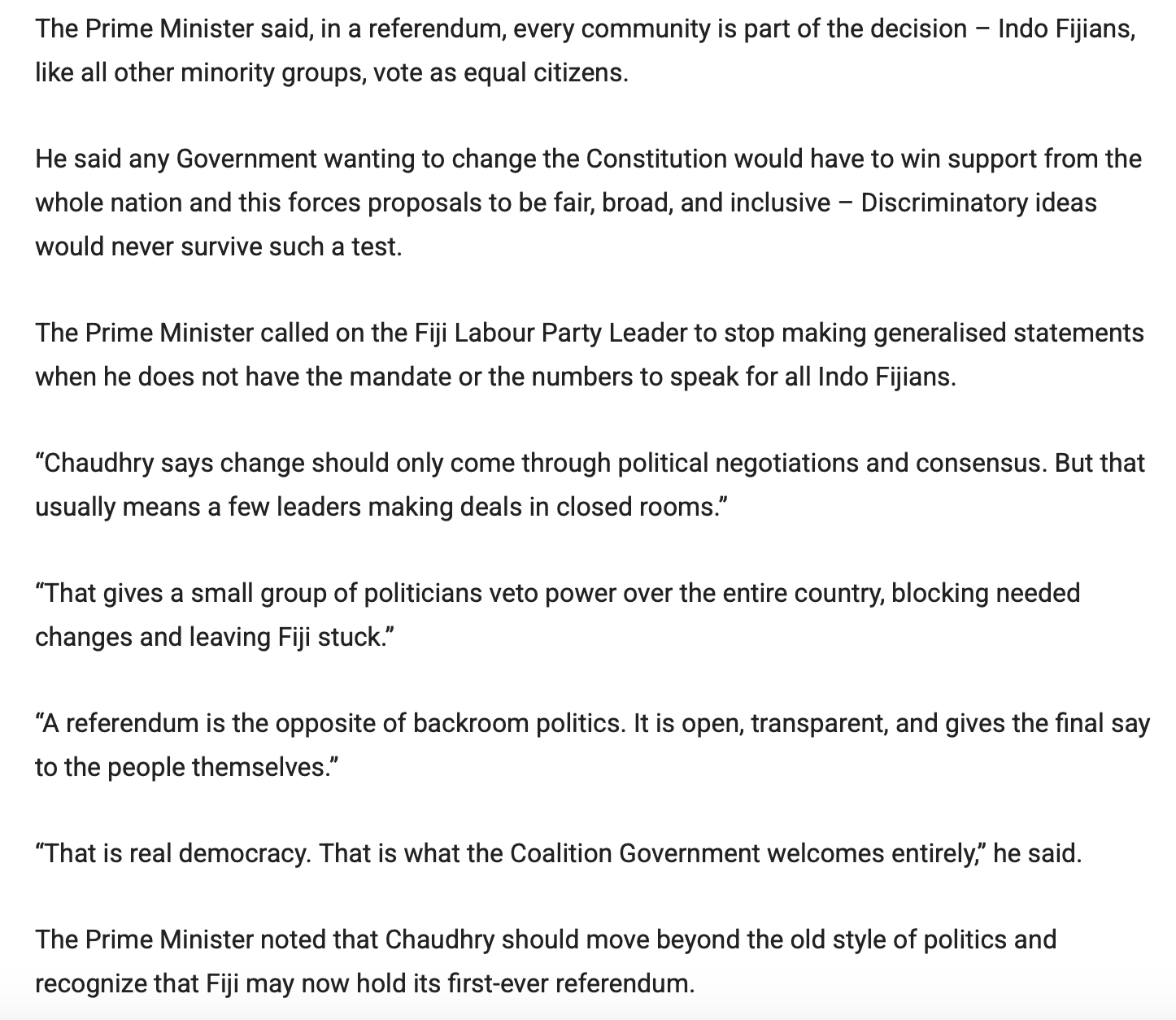 2/ Sitiveni Rabuka and Biman Prasad make public statements that the common and equal citizenry and common identity provisions of the 2013 Constitution are safe. And the Prime Minister gives a cast-iron guarantee that he will protect them and they will not be part of any vote in the parliament and any referendum.