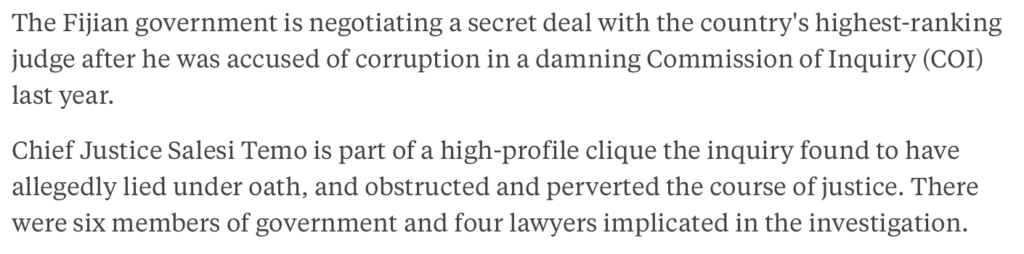 Yet it is even more extraordinary that Fa has given an interview to Radio New Zealand that blows open a secret agreement between Temo and the Rabuka government to get him off the hook and throttle the COI altogether. And contains a great deal of disinformation about the facts of what has happened which we detail below after the RNZ story itself.