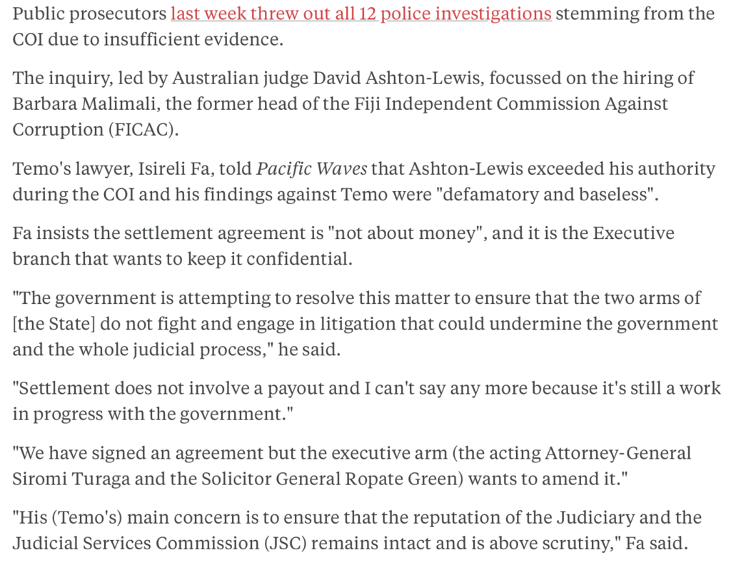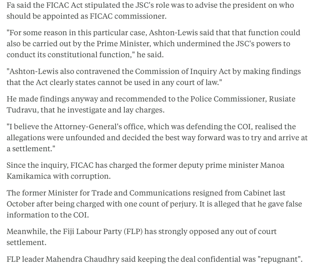 1/ In his ill-judged interview with Radio New Zealand partially lifting the lid on the supposedly secret settlement agreement between the state and the JSC, Isireli Fa – Salesi Temo’s lawyer – indicates that impediments have suddenly emerged to concluding the agreement. Someone is asking for “amendments”. Who?
